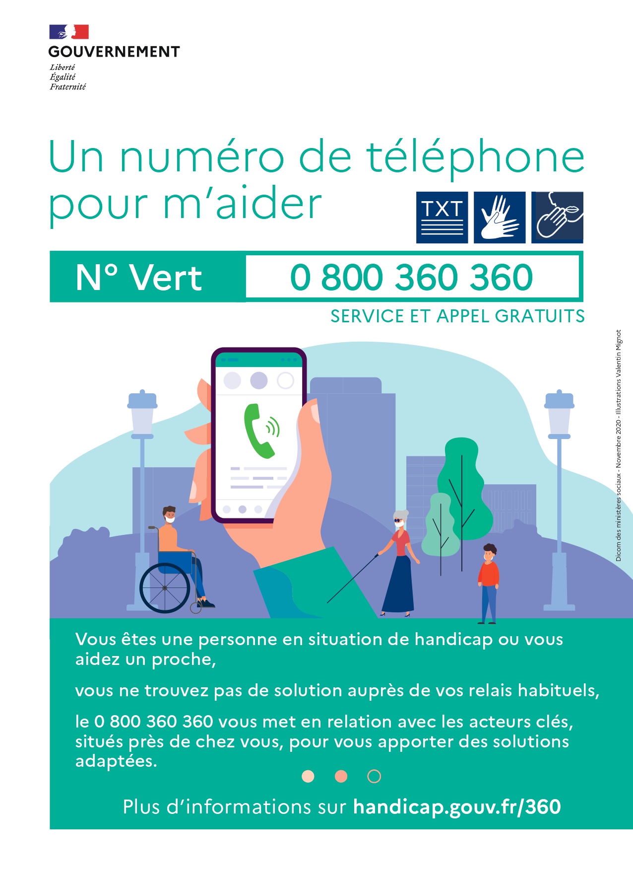 Le 0 800 360 360 est un numéro vert qui vous permet d’entrer directement en relation avec des acteurs impliqués dans l’accompagnement des personnes handicapées près de chez vous. Vous êtes une personne en situation de handicap ? Un proche aidant ? Vous avez besoin de conseils, d'une solution d'accompagnement, d'aide pour accéder aux soins ? Appelez le n° vert et composé votre n° de département.